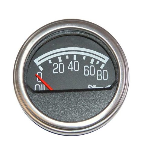 76-86 CJ Oil Pressure Gauge-Factory style replacement. The light bulb and socket are not included. This gauge measures 2" outside diameter and read 0-80 lbs of pressure. Comes with all the attaching hardware. -